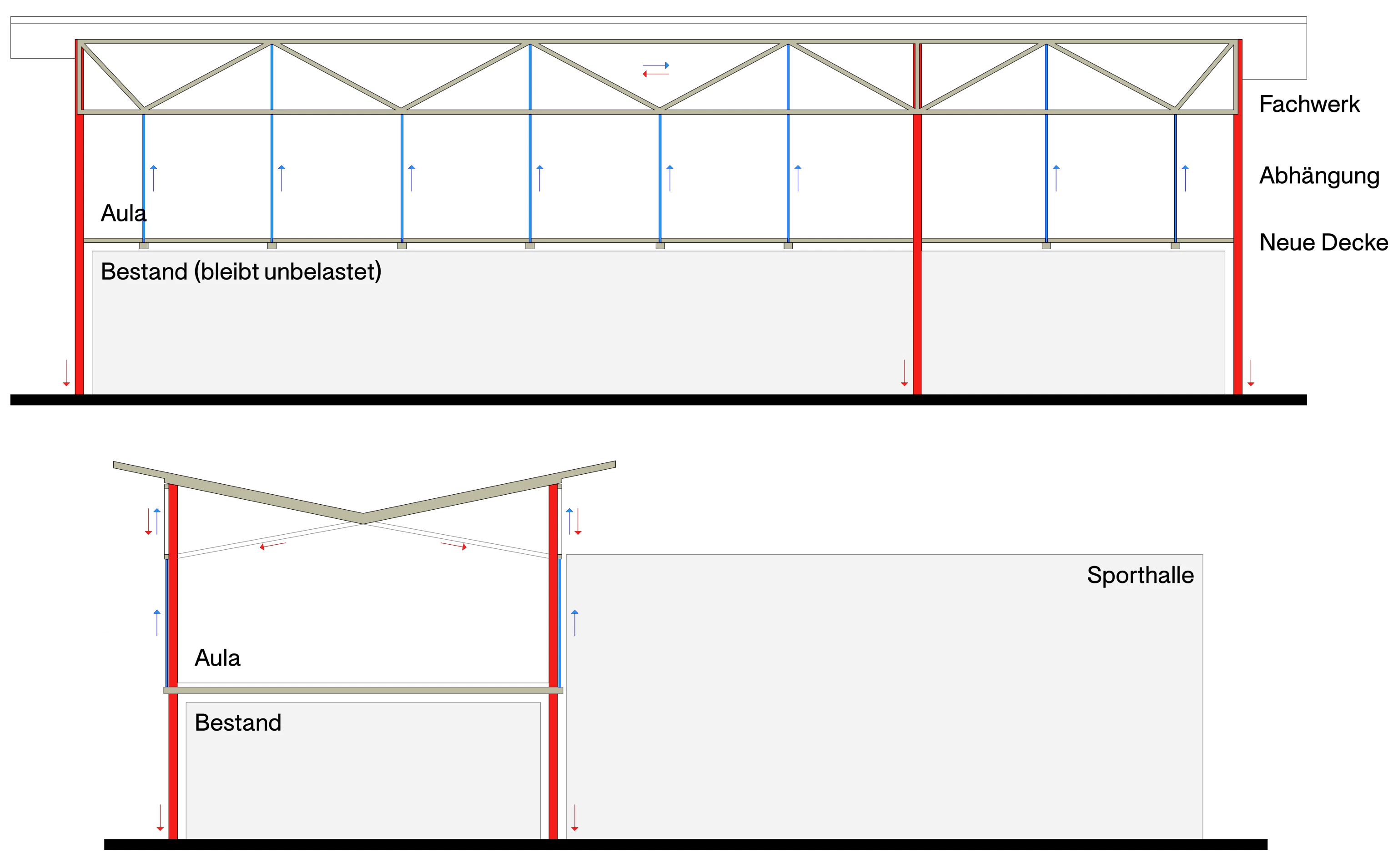Die neuen Baukoerper kombinieren repetitive Holzrahmen mit gezielt eingesetzten Beton- und Stahlelementen. Aussteifende Kerne und praezise platzierte Tragglieder sichern die Erdbebenstabilitaet, waehrend leichte Holzdecken die Lasten reduzieren und den Eingriff in den Bestand minimieren. Die neue Aula wird uebereinanderliegend von parallel gefuehrten Fachwerktragwerken getragen und schwebt mit minimalem Aufwand ueber dem bestehenden Bau.
