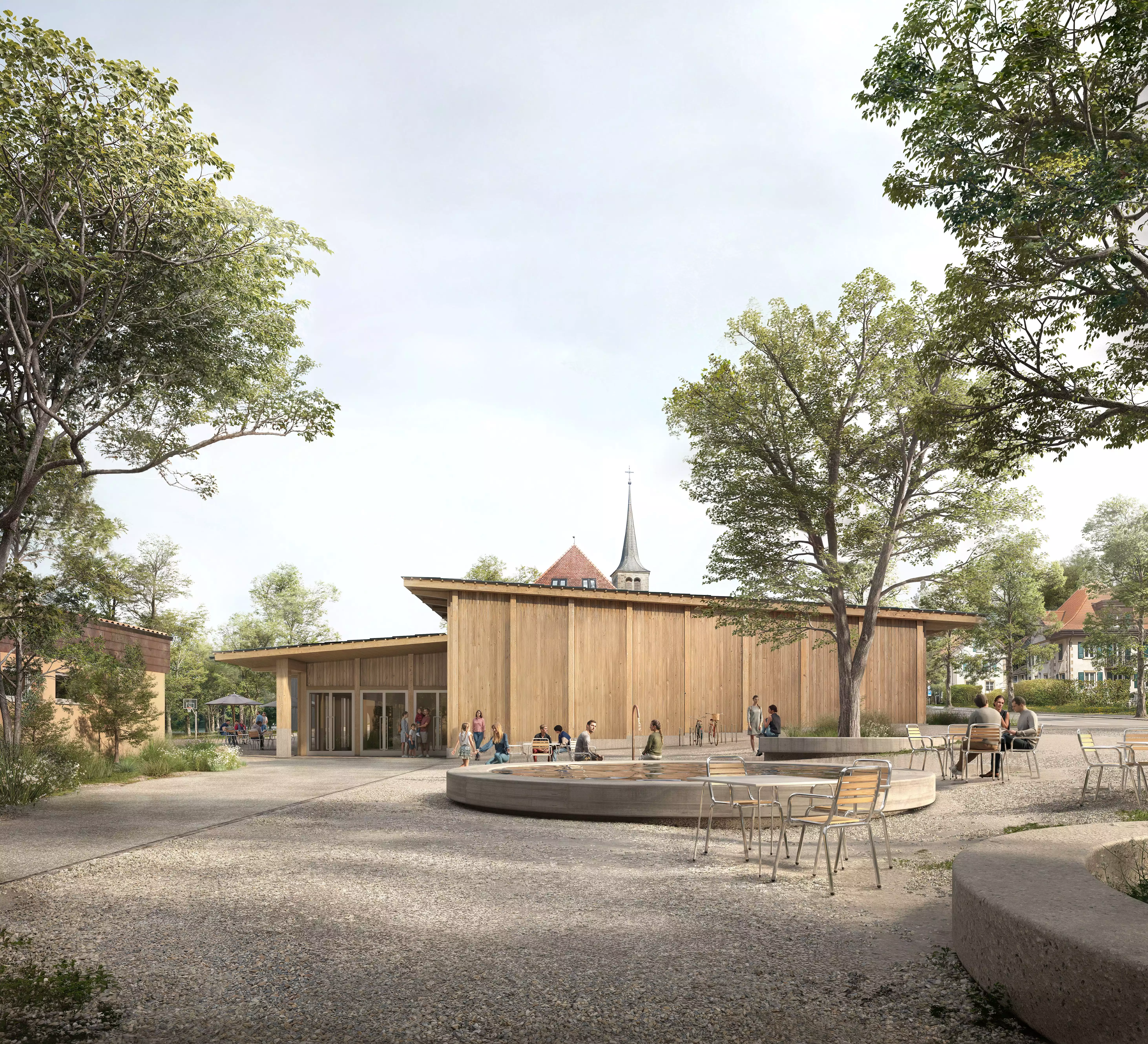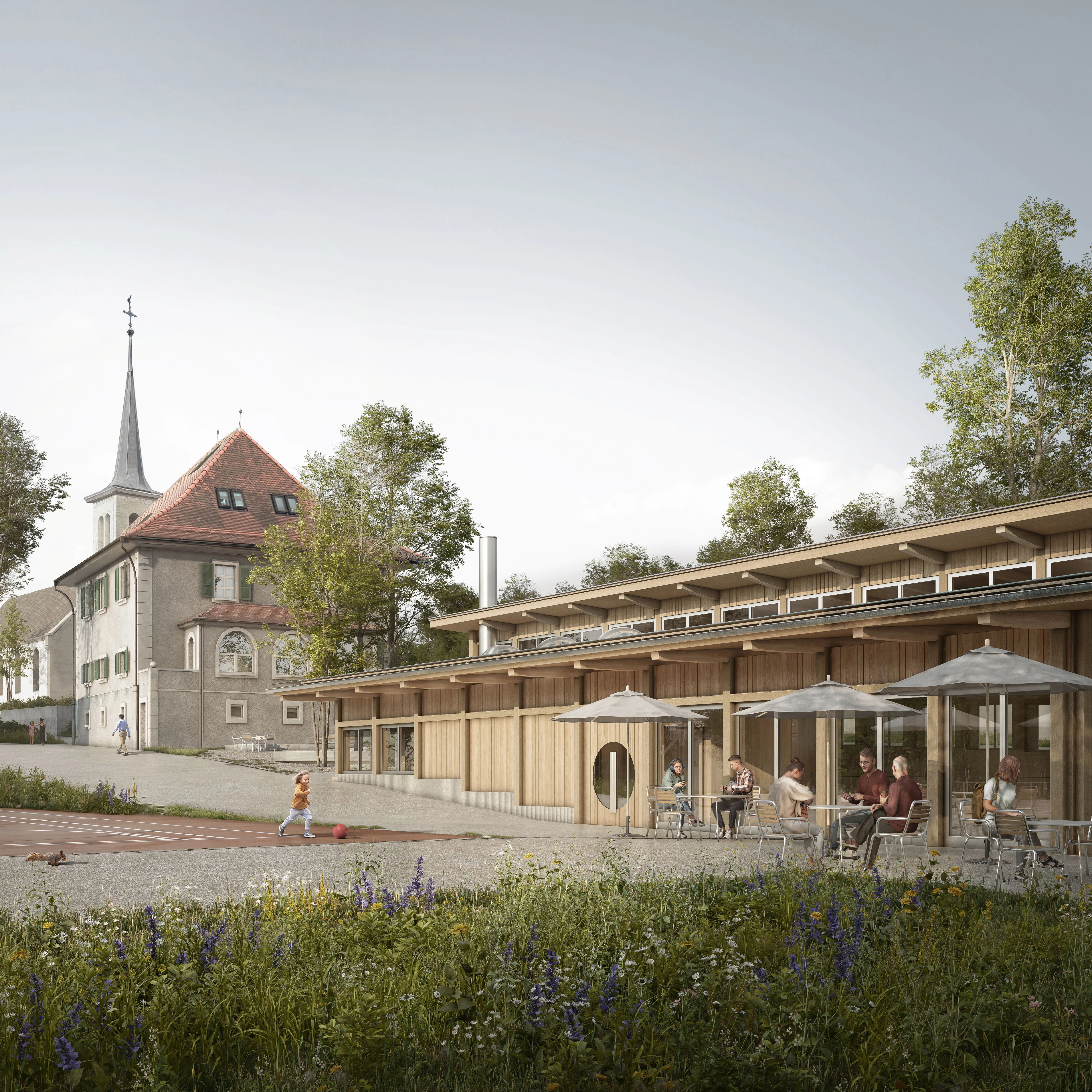 Das Projekt zielt auf eine schlichte, einfache und effiziente Konstruktion ab, die den von der Gemeinde definierten Grundsätzen entspricht: Schlichtheit, Einfachheit und ästhetische Qualität. Es sieht eine gemischte Holz-/Beton-/Stahlkonstruktion vor, wobei jedes Material entsprechend seinen spezifischen Eigenschaften verwendet wird. Die großen Spannweiten der Sporthalle werden durch dünne Holzbalken gewährleistet, die mit Kabeln und Metallzugstangen verbunden sind, welche die Lasten aufnehmen. Diese Wahl ermöglicht es, das Bauvolumen zu reduzieren und die Kosten zu optimieren. Der Dachüberstand wird dank eines Holzgitterträgers sinnvoll genutzt und fördert die Durchlässigkeit zwischen den Gängen und der Sporthalle.