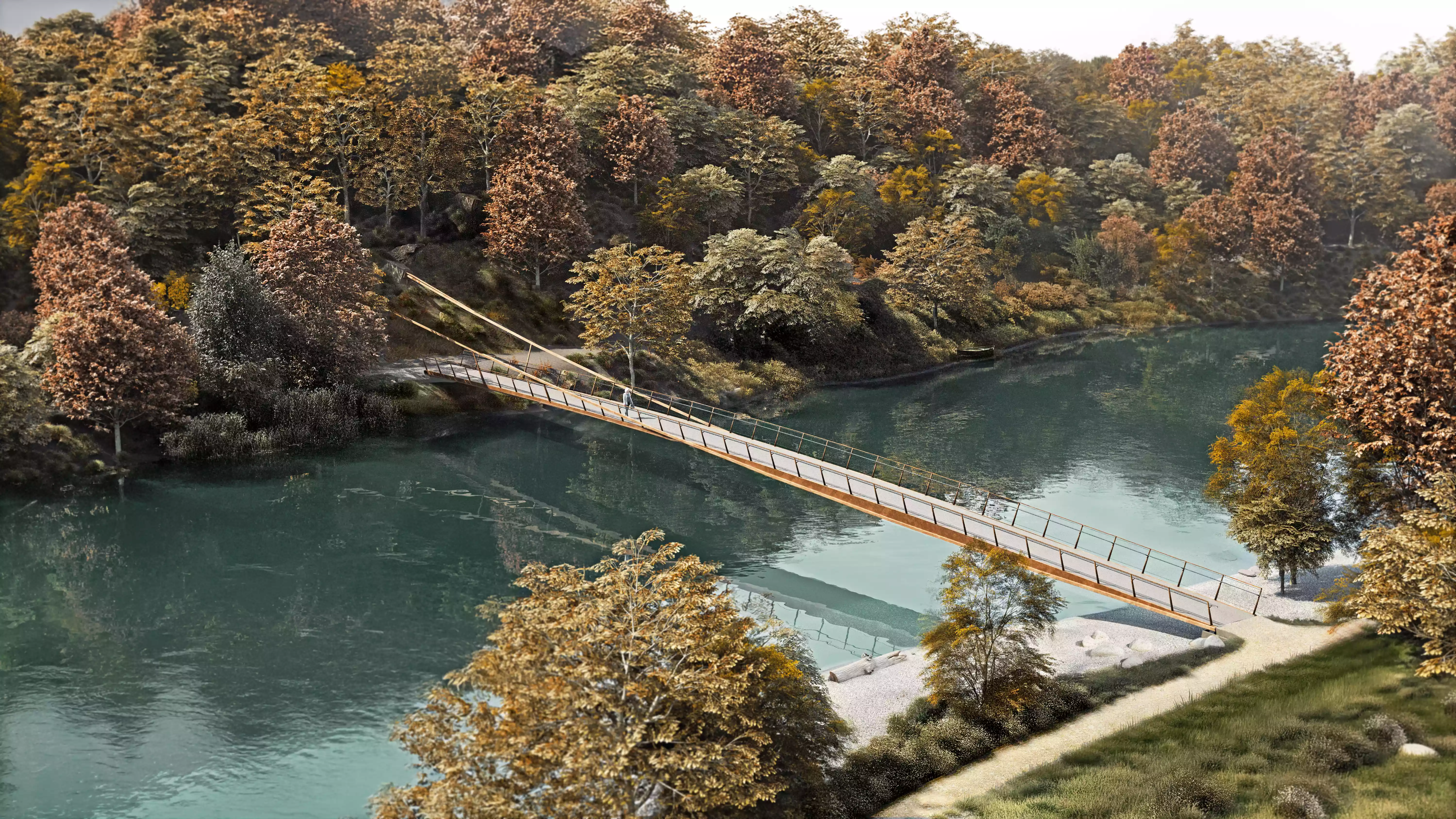Le pont s’adapte avec précision à la topographie du site. Il reprend l’asymétrie paysagère entre la pente rocheuse du côté de Bremgarten et la péninsule plate du Zehendermätteli. L’ancrage est donc différent : du côté de Bremgarten, la structure porteuse s’ancre dans la roche, tandis que la passerelle du côté du Zehendermätteli repose légèrement sur le sol – un contact précis, presque flottant, avec le paysage.