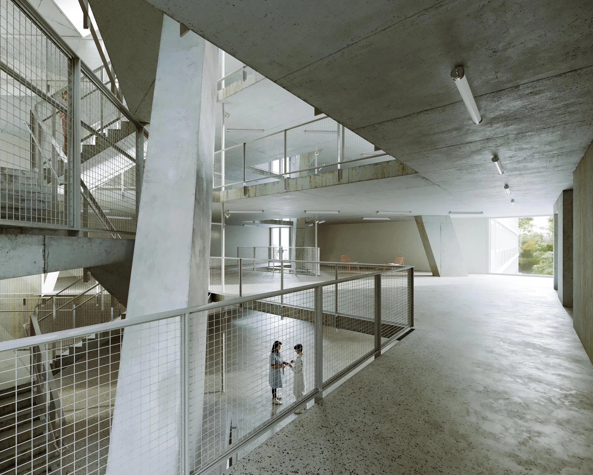 Das Gebäude besteht aus vier Flügeln und einem zentralen Teil, wobei jeder Bereich statisch unabhängig von den anderen funktioniert. In den Flügeln ruht die siebenstöckige Stahlbetonskelettstruktur auf vorgespannten Rahmen im Erdgeschoss, wodurch ein säulenfreies Untergeschoss ermöglicht wird. Im Zentrum des Gebäudes sind alle Decken an das Dachgehängt, um im Erd- und Untergeschoss freie Flächen für die Verkehrsbereiche zu schaffen. Die Kräfte werden von den Enden der Zugstäbe über Diagonalen abgeleitet, die den Raum sowie die dreieckigen Treppenhäuser strukturieren.