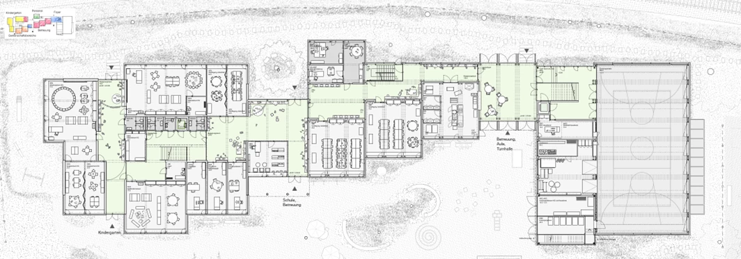 Die neuen Baukoerper kombinieren repetitive Holzrahmen mit gezielt eingesetzten Beton- und Stahlelementen. Aussteifende Kerne und praezise platzierte Tragglieder sichern die Erdbebenstabilitaet, waehrend leichte Holzdecken die Lasten reduzieren und den Eingriff in den Bestand minimieren. Die neue Aula wird uebereinanderliegend von parallel gefuehrten Fachwerktragwerken getragen und schwebt mit minimalem Aufwand ueber dem bestehenden Bau.